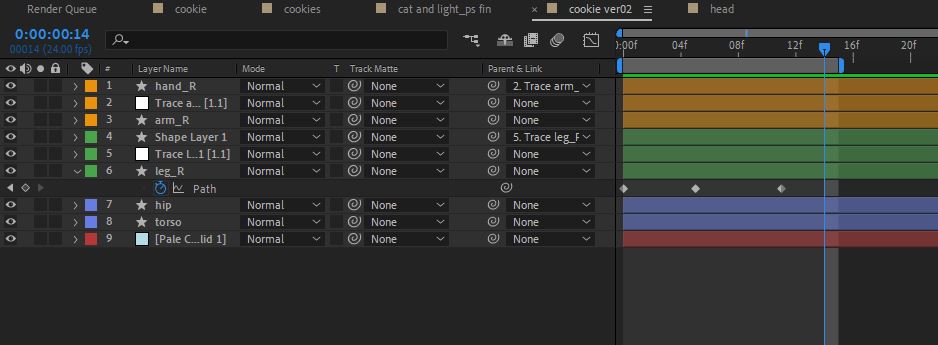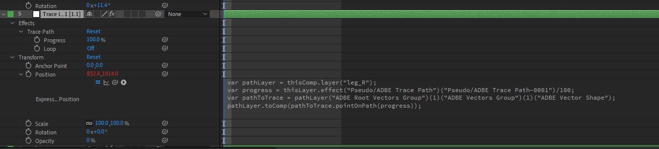 trace null 레이어를 열어보면 progress와 로테이션 뭐 이거저거 다 expression이 걸려있는데